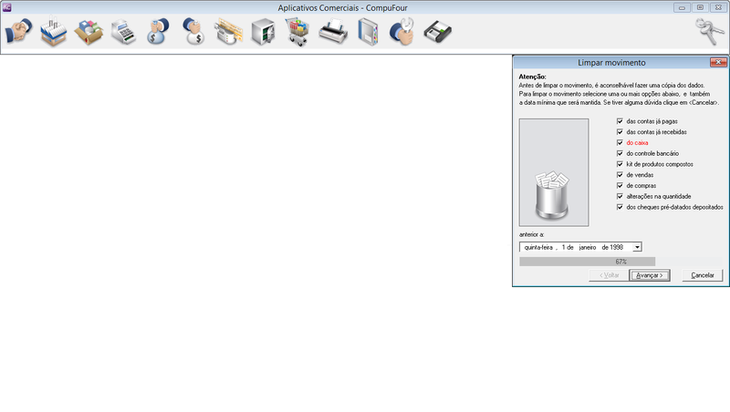 Selecione quais os movimentos em que deseja efetuar a limpeza, informe qual a data que será utilizada como base para a limpeza, dessa maneira tudo que for anterior a data informada terá a movimentação apagada.