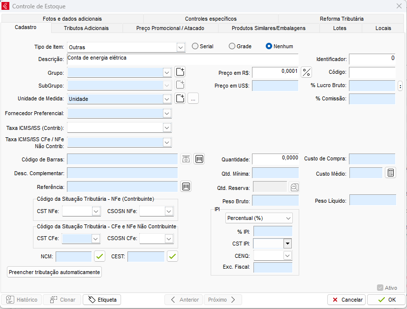 Preencha os seguintes campos do cadastro do produto no estoque: