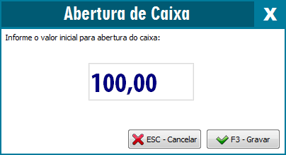 Obs: Ao efetuar a primeira venda do dia será solicitado o valor inicial para a abertura do caixa e um comprovante poderá ser impresso.