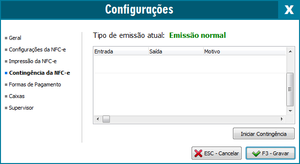 Nesta tela poderá ativar a emissão da NFC-e em Contingência. Ao clicar em Iniciar Contingência, informe o motivo e clique em OK.