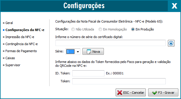 Guia Configurações da NFC-e -  o Supervidor deverá configurar o ambiente em que a empresa irá emitir as Notas Fiscais do Consumidor Eletrônica, juntamente com a seleção do certificado digital.