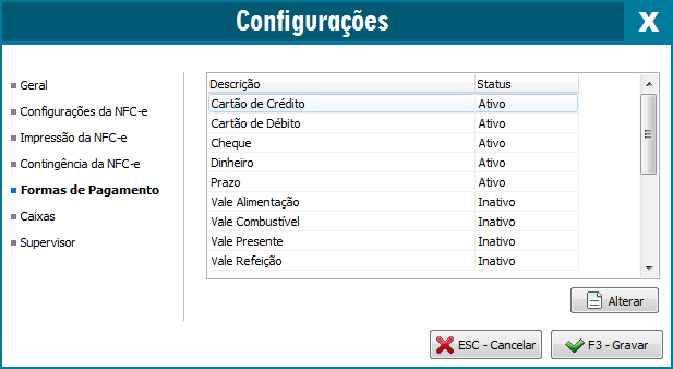 Guia Formas de Pagamento -  poderá ativar ou inativar as formas de pagamento que são aceitas pela NFC-e, configure-as conforme sua empresa trabalha.