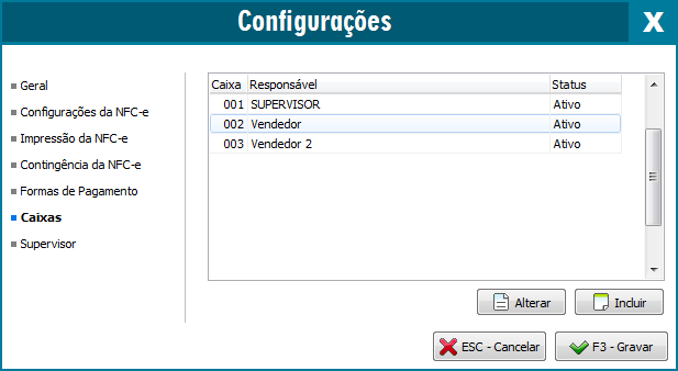 Guia Caixas -  Esta opção permite incluir a quantidade de caixas que a empresa utiliza e informar qual é o responsável por cada um. Assim, com a configuração correta é possível ter controle de comissões e finalizações de venda de cada caixa.