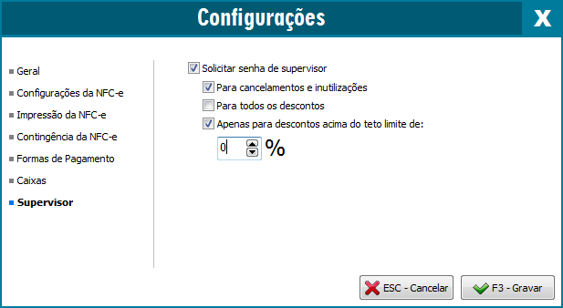 Guia Supervisor - permite efetuar configurações, para que o supervisor possa limitar os descontos concedidos pelos caixas, e para o cancelamento da NFC-e. Para que o caixa possa dar sequência ao procedimento de cancelamento e/ou desconto será necessário a autorização do supervisor.