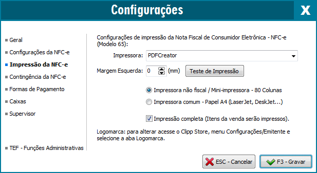 Guia Impressão da NFC-e - Permite configurar a impressora que irá efetuar a impressão dos documentos emitidos pela transmissão da NFC-e, impressora esta que deverá estar instalada no Windows. A mesma poderá ser do tipo 80 colunas, não fiscal para melhor impressão dos documentos.