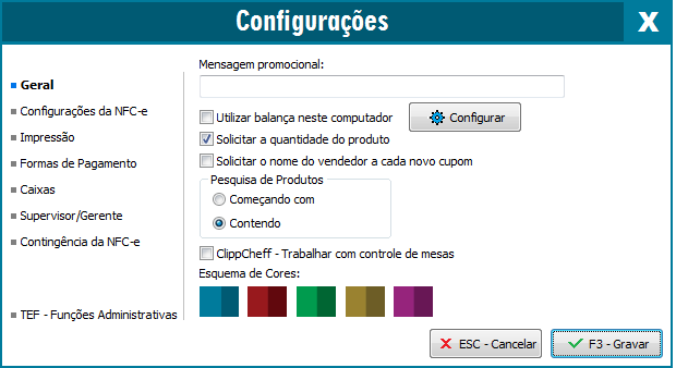 Guia Geral - Nesta opção poderá realizar configurações específicas referentes ao esquema de cores, bem como, a opção para indicar que será utilizada a balança para pesar os produtos. Também será possível definir se a quantidade do item será solicitada quando o mesmo for inserido na NFCe e o tipo da pesquisa pelo nome do item quando o mesmo for lançado no documento de venda.