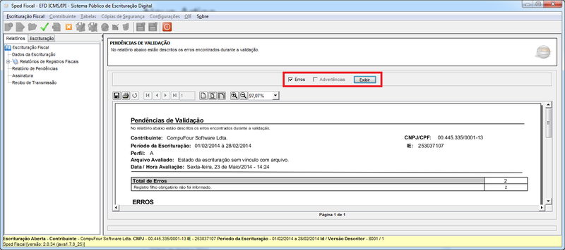 Durante a validação serão apresentadas algumas mensagens, ao concluir esse processo será exibida a tela abaixo, para visualizar os erros, marque a opção Erros e clique em Exibir;