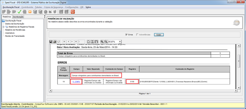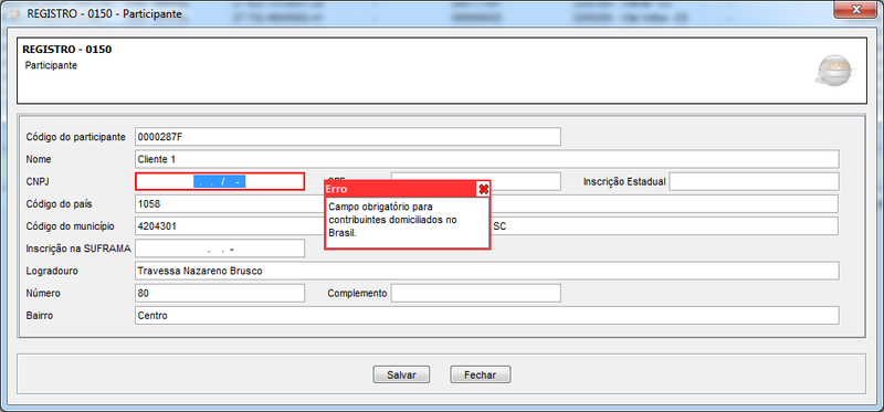 Na situação abaixo teremos o seguinte cenário, uma divergência apresentada no Registro 0150, no campo 5 - CNPJ, o que acontece é apresentado no campo Mensagem: Campo obrigatório para contribuintes domiciliados no Brasil. Nesse exemplo o Participante (cliente ou fornecedor) não tem em seu cadastro o CNPJ preenchido.
