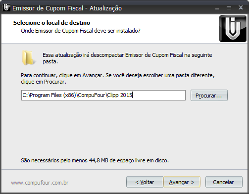 2. Então será solicitada a pasta onde deve ser feita a atualização, pasta essa que deverá ser a mesma onde o sistema está instalado (pasta padrão: C:\Arquivos de programas\CompuFour\Clipp\Exe);