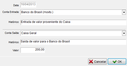 Na opção Conta Saída deverá selecionar a conta de onde saiu este valor, caso tenha dúvidas, consulte sua contabilidade.