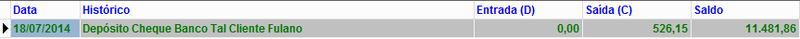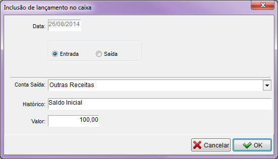 Neste exemplo, o saldo será positivo, portanto marcamos a opção Entrada (valor que entrará no caixa, débito).