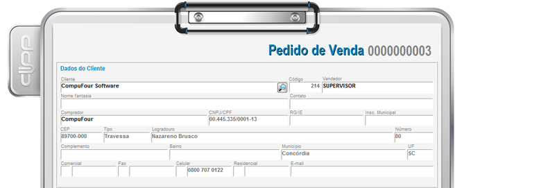 Em primeiro lugar, será necessário informar o cliente previamente cadastrado no sistema e todas as suas informações serão preenchidas automaticamente. O comprador será a pessoa responsável que está solicitando o pedido.