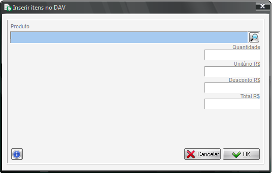Para finalizar o DAV através de um Cupom Fiscal, acesse o módulo Emissor de Cupom Fiscal, inicie uma nova venda e no momento que forem solicitados os produtos, pressione a tecla Insert. Será aberto o módulo de importações, solicitando a importação do DAV.