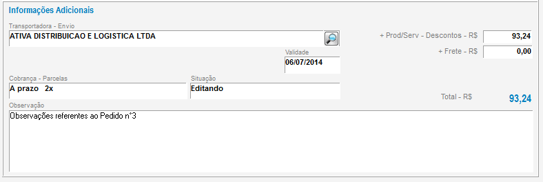 Nas informações adicionais é possível definir antecipadamente qual transportadora fará a entrega da mercadoria, bem como informar o valor do frete. Ainda é possível definir a validade deste pedido e os parcelamentos que poderão ser utilizados após o faturamento.