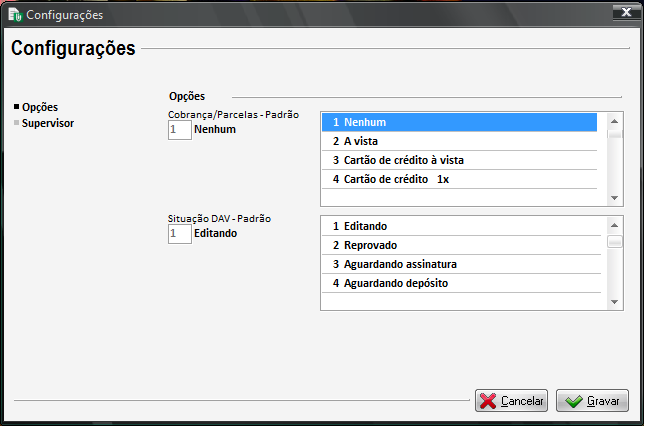 Ao acessar o menu Configurações é apresentada a tela abaixo, nela poderá definir qual parcelamento e status padrões dos DAV's.