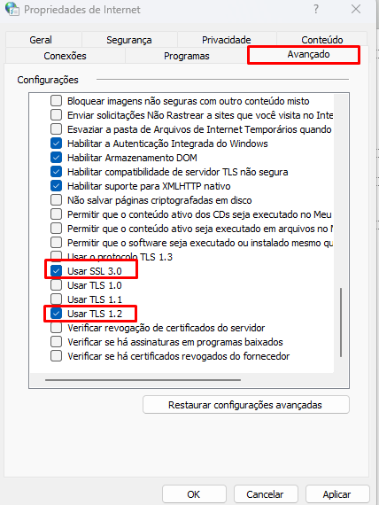 Ainda aba Avançadas habilite a seguinte opção: