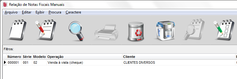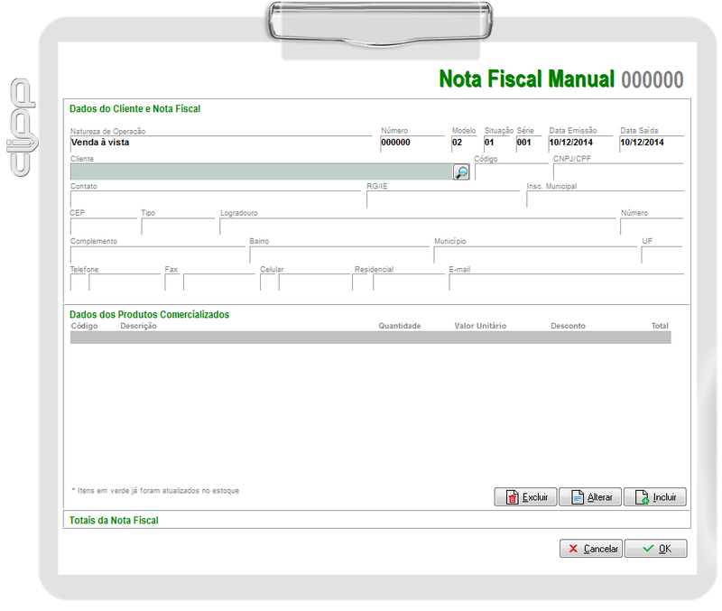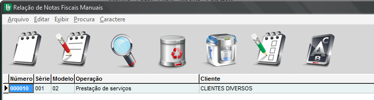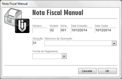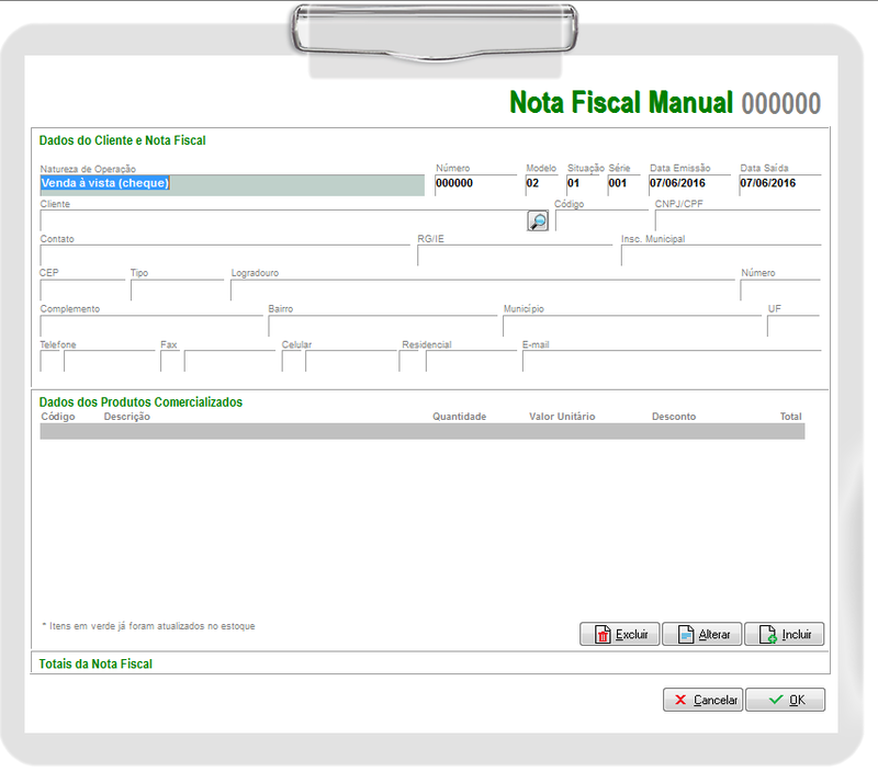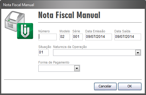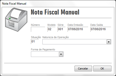 Na nota fiscal manual deverá lançar o Número, Modelo, Data Emissão, Data Saída, Situação e Série da nota em questão (o modelo nesse caso sugerimos que seja modelo 02, com base nos manuais atuais é o modelo a ser usado. Sugerimos que da mesma forma seja consultado o contador da empresa).