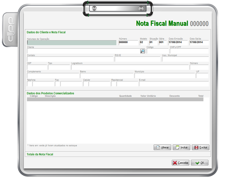 Na nota fiscal manual deverá lançar a natureza de operação desejada (a mesma deve estar cadastrada no Clipp Store), após informe o Número, Modelo, Situação, Série e data da nota em questão (o modelo nesse caso sugerimos que seja modelo 02, com base nos manuais atuais é o modelo a ser usado. Sugerimos que da mesma forma seja consultado o contador da empresa) após informe o cliente, os itens e as demais informações necessárias.