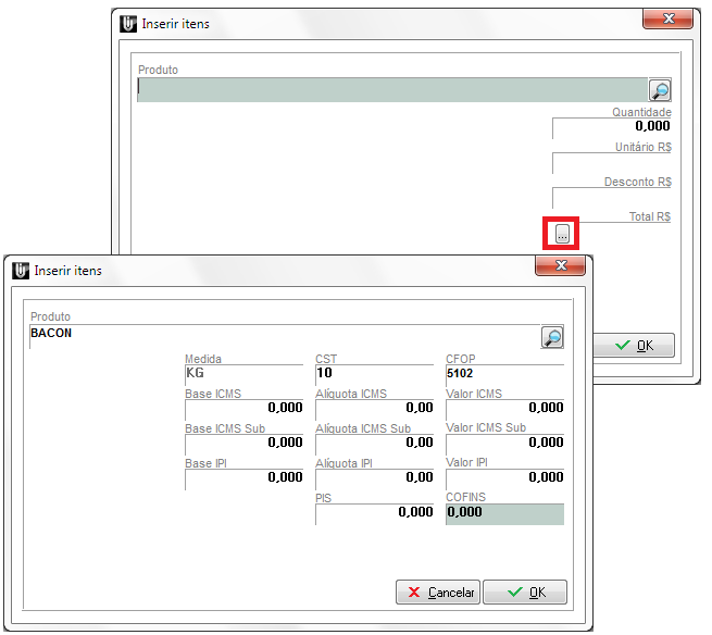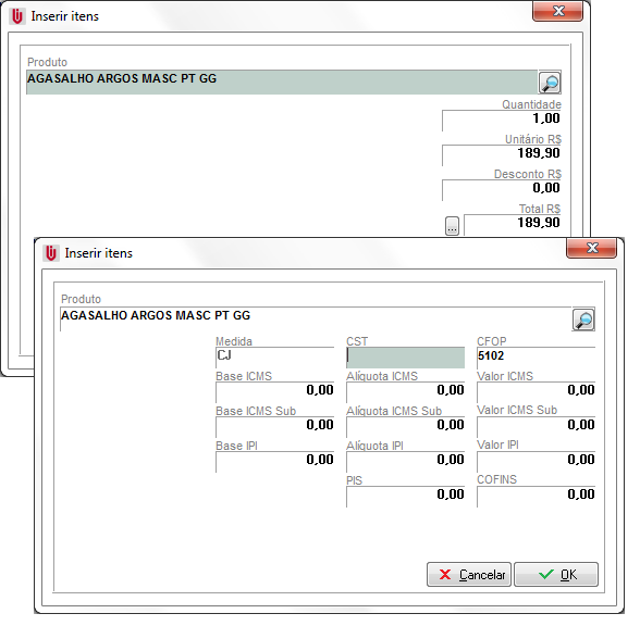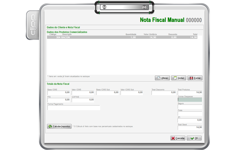 Poderá ser lançado o produto mesmo não tendo quantidade disponível em estoque, porém este não poderá ser atualizado posteriormente. Nesse módulo não será permitido Acréscimos, apenas descontos. Concluída o lançamento clique em OK. Após o lançamento dos itens, caso for necessário que sejam calculados impostos na venda, deve clicar em Calcular Impostos, tudo isso será baseado nas informações do cadastro do produto no estoque e do cadastro da natureza de operação.