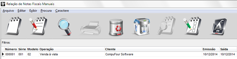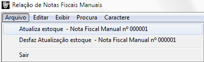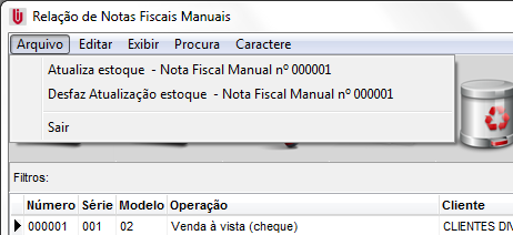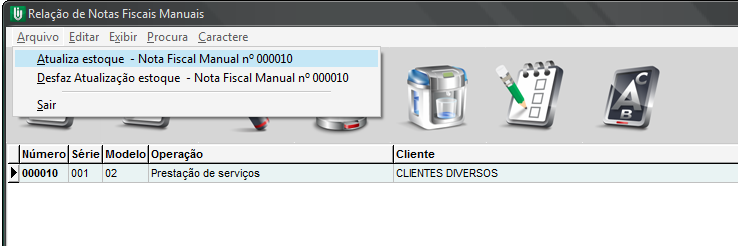 Pronto! Está criada a nota manual, porém os produtos lançados nessa nota ainda constam no estoque, para que o estoque fique correto será necessário atualizar os dados referente a essa nota. Para isso selecione a nota, acesse o menu Arquivo / Atualiza estoque – Nota Fiscal Manual nº 000001.
