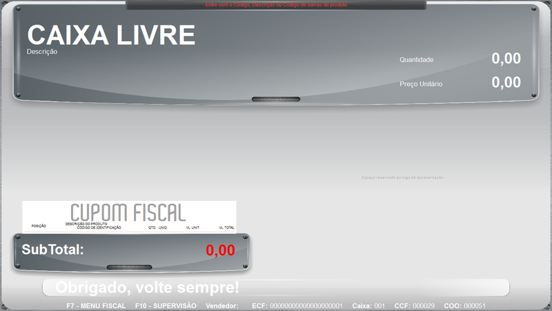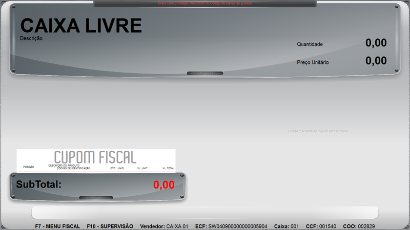 Após informe a a natureza de operação desejada (a mesma deve estar cadastrada no Clipp Store) e Forma de Pagamento (serão permitidas apenas as formas de pagamento Dinheiro ou Prazo) e após clique no OK e será apresentada a tela de Caixa Livre: