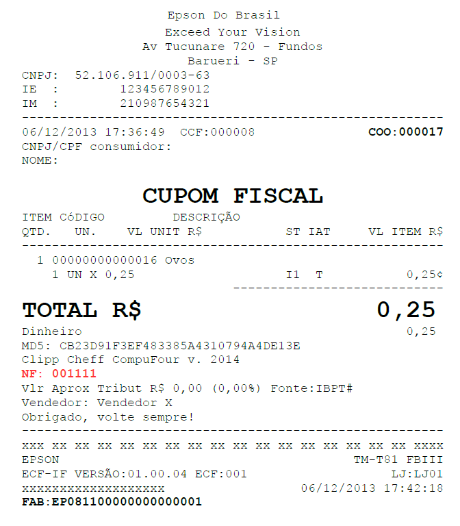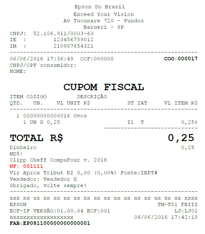 Os procedimentos para finalização são iguais à do cupom fiscal, pressionando F3 – defina a forma de pagamento utilizada e finalize, o cupom fiscal será impresso da mesma forma que um cupom fiscal normal, porém nas observações informará o número da NF Manual lançada, conforme exemplo abaixo: