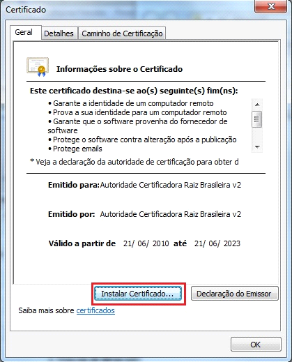 AC_Certisign_MultiplaG5.cer.Quando a janela "Certificado" aparecer, clique no botão "Instalar certificado" (localizado na parte inferior da janela);