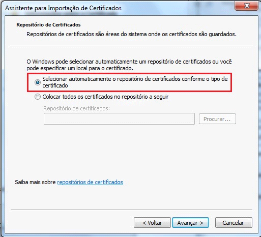 4. Clique em "Avançar". Deixe marcada a opção "Selecionar automaticamente o armazenamento de certificados conforme o tipo de certificado";