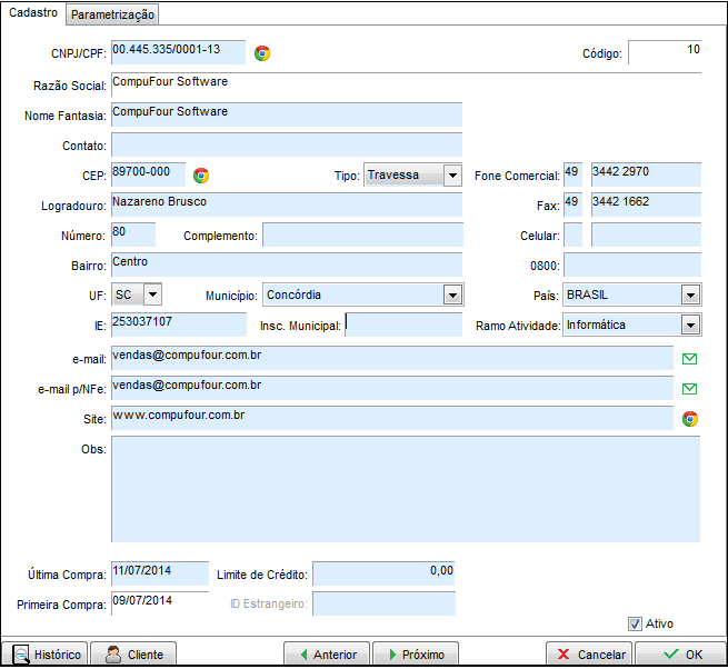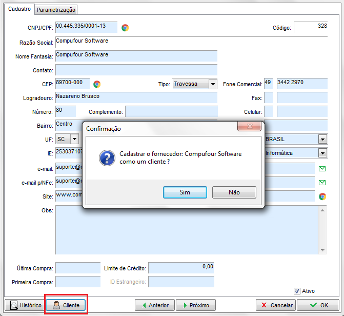 Na parte inferior da tela contemplamos o botão Cliente, este poder ser utilizado em situação que o fornecedor é também cliente, ao clicar no botão será solicitado a confirmação para cadastrar o registro atual como cliente, ao confirmar, automaticamente o cadastro do fornecedor será exportado para a tabela de clientes, conforme tela a seguir:
