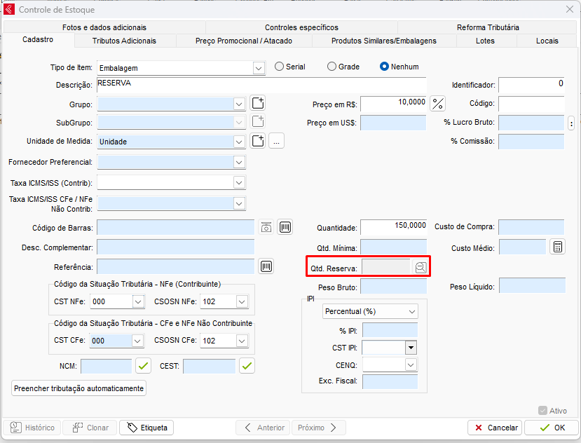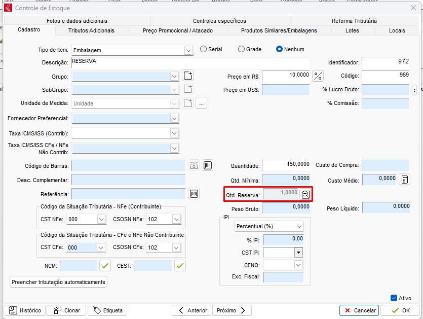 Após o lançamento de um DAV – Pedido de Venda com o Status (Situação) como Reservado, o campo de Quantidade Reserva no cadastro do Produto em seu Cadastro de Estoque será preenchido automaticamente, conforme imagem abaixo: