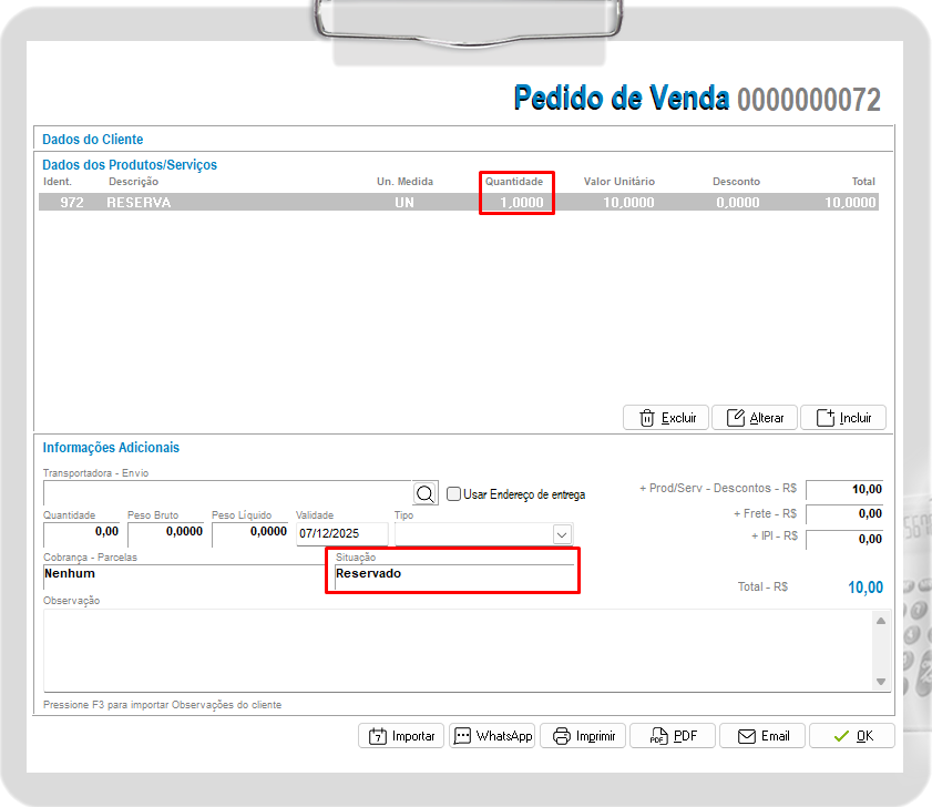 Observações: Lembrando que a quantidade reservada não ira impedir o lançamento do produto em outro DAV – Pedido de Venda.