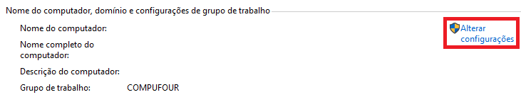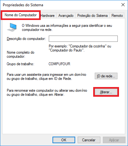 Será aberta uma nova tela, clique na aba "Nome do Computador" e clique na opção "Alterar".