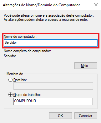 Para finalizar, insira o nome que você deseja no campo “Nome do computador”, mantendo apenas letras, sem acentos ou caracteres especias. Ex: Servidor, Terminal. Clique em “OK” para que as alterações sejam aplicadas e reinicie o computador.