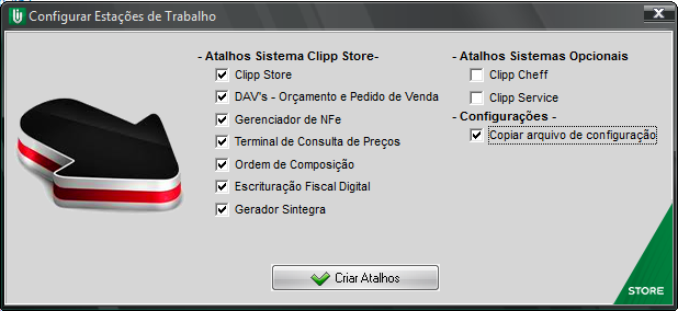 Agora, encontre e execute o Atalhos.exe dentro da pasta, marque a opção Copiar arquivo de configuração, Clipp Store, Gerenciador de NFe e os demais ícones que irá utilizar e clique em Criar Atalhos;