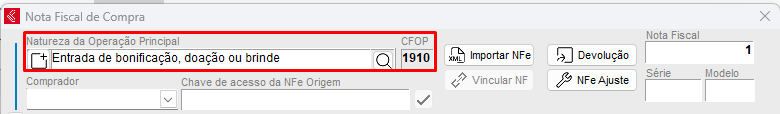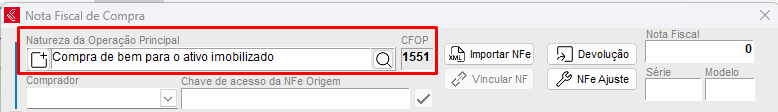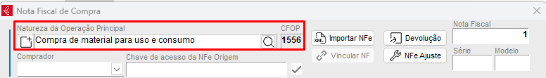 Após cadastrada a Natureza de Operação, acesse o módulo de Compras, clique no botão Novo e insera o número da nota, série e modelo. Feito isso, selecione a Natureza de Operação em questão.