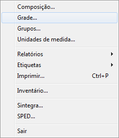 Será necessário efetuar o cadastro das características que compõem a grade. Para efetuar o cadastro destas, basta acessar o Clipp Store e depois o módulo de Estoque. Posteriormente clique no menu Arquivo / Grade, conforme tela a seguir: