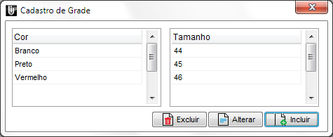 Neste momento podem ser cadastradas as cores e tamanhos, conforme próxima tela: