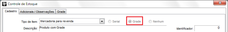 Em seguida, para cadastrar o novo produto do estoque clique no botão “Novo”ou clique no menu Editar / Novo. Na tela apresentada será necessário definir o tipo do item, nesta situação selecionaremos o tipo mercadoria para revenda, caso sejam produtos que serão revendidos e após, selecione a opção Grade.