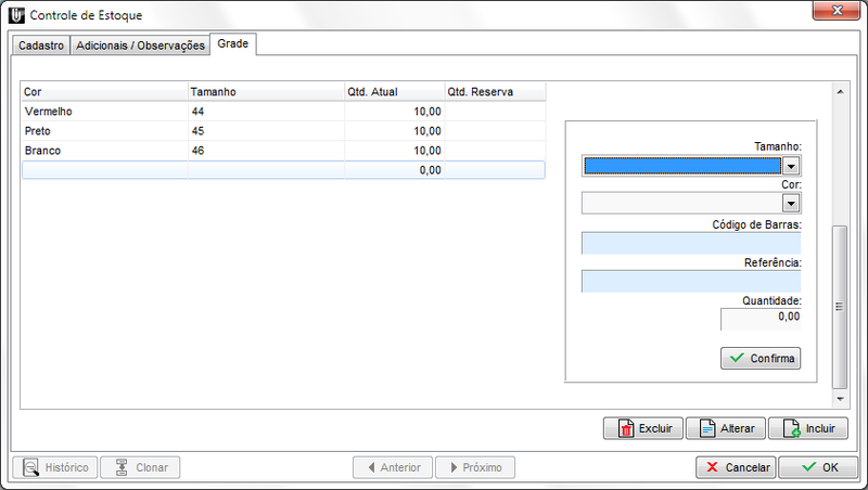 Preencha os dados, cor, tamanho e quantidade (obrigatoriamente deve inserir Tamanho e Cor, já referente a quantidade poderá inserir zero para posteriormente efetuar o lançamento através da nota de entrada) e clique no botão Confirma.