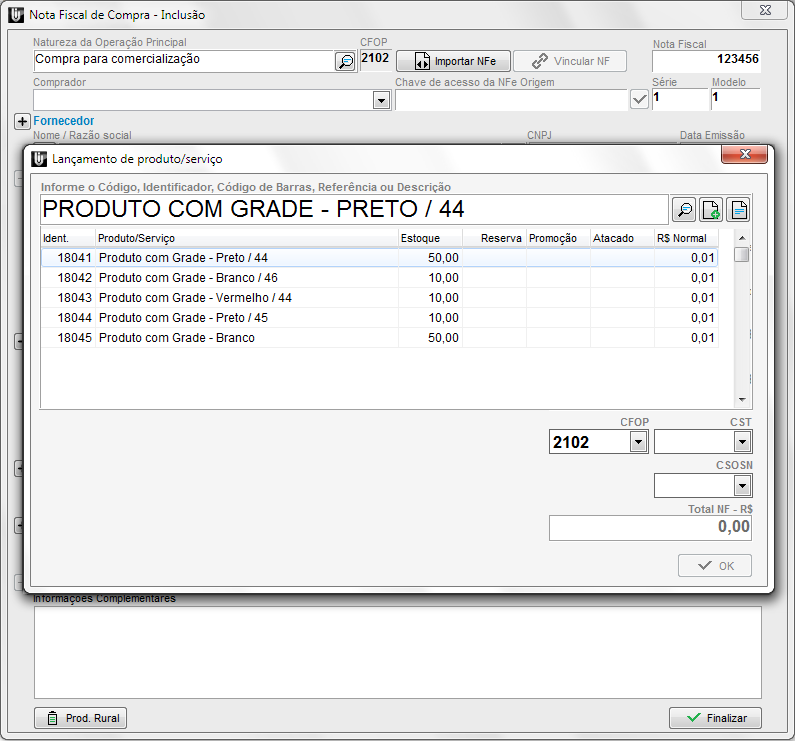 Selecione então todos os itens que deseja, informe seus devidos dados conforme nota do fornecedor e clique em OK para que os mesmos sejam inclusos na nota fiscal. Confira os demais dados e Finalize a nota.