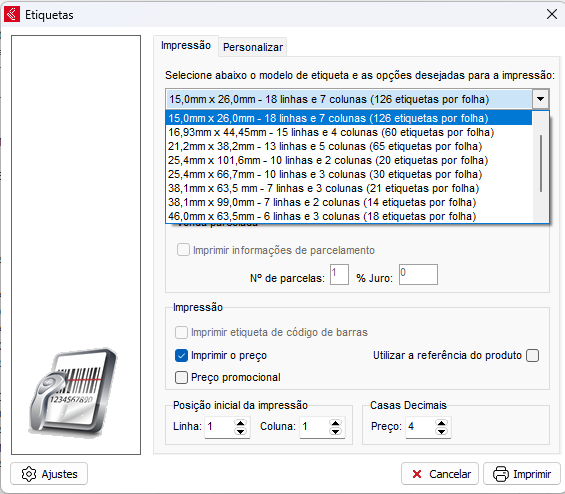 • Imprimir etiqueta de código de barras: irá imprimir as etiquetas com código de barras (* Os códigos devem estar cadastrados nos itens com 8, 12, 13, 14 ou 18 dígitos.);