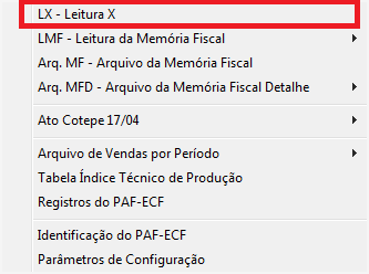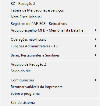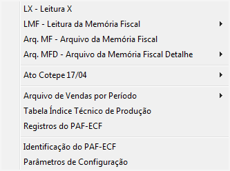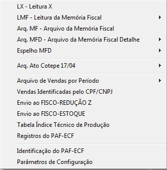 Nesse menu são apresentadas todas as funções fiscais da Impressora Fiscal, como relatórios gerenciais gerados pela impressora, identificação da PAF-ECF, Nota Fiscal manual, entre outros relatórios.