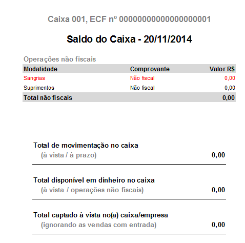 Informa o saldo do caixa deste dia das Operações não fiscal, o total de movimentação no caixa, Total disponível em dinheiro no caixa e o Total captado à vista no(a) caixa/Empresa, como pode visualizar no relatório abaixo:
