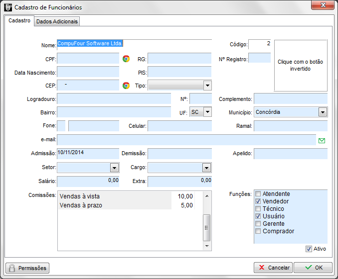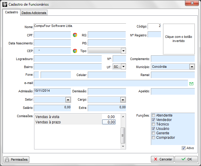 Para cadastrar o Funcionário “Vendedor” faça o seguinte procedimento: