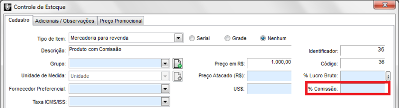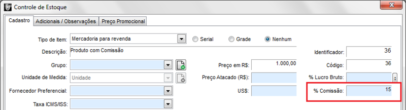 Para que a comissão seja calculada ao vendedor, o campo % Comissão dentro do cadastro do item no estoque deve estar em branco (para acessar o cadastro do produto, clique em Estoque e clique duas vezes sobre o produto desejado). Veja exemplo abaixo: