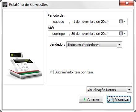 Na próxima tela, informe o Período desejado e selecione o Vendedor. Também terá algumas opções disponíveis como: Discriminar item por item e Gravar comissões como salário “extra”.