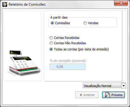 Permite gerar o relatório de comissões, sendo possível definir o valor da comissão no momento em que o relatório é gerado, independentemente dos valores de comissão configurados para o produto ou vendedor.