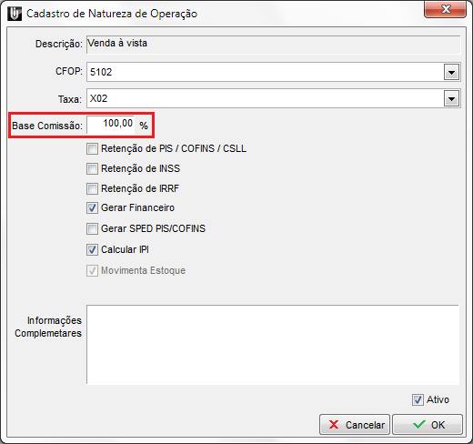 Acesse Configurações > Operações de ICMS/ISS > Naturezas... Abra o cadastro do CFOP utilizado nas vendas. A Base Comissão deve estar preenchida com a porcentagem sobre a qual será paga a comissão do vendedor.