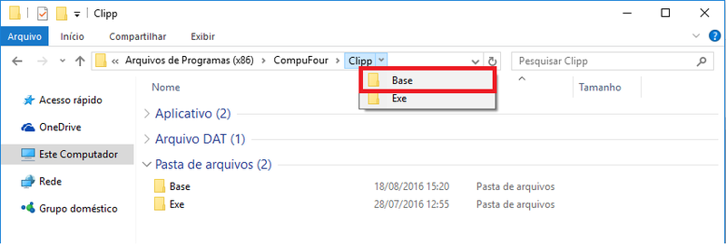 A base de dados fica gravada na pasta Base onde o sistema encontra-se instalado (pasta padrão C:\Arquivos de Programas\CompuFour\Clipp\Base ou C:\Arquivos de Programas (x86)\CompuFour\Clipp\Base).