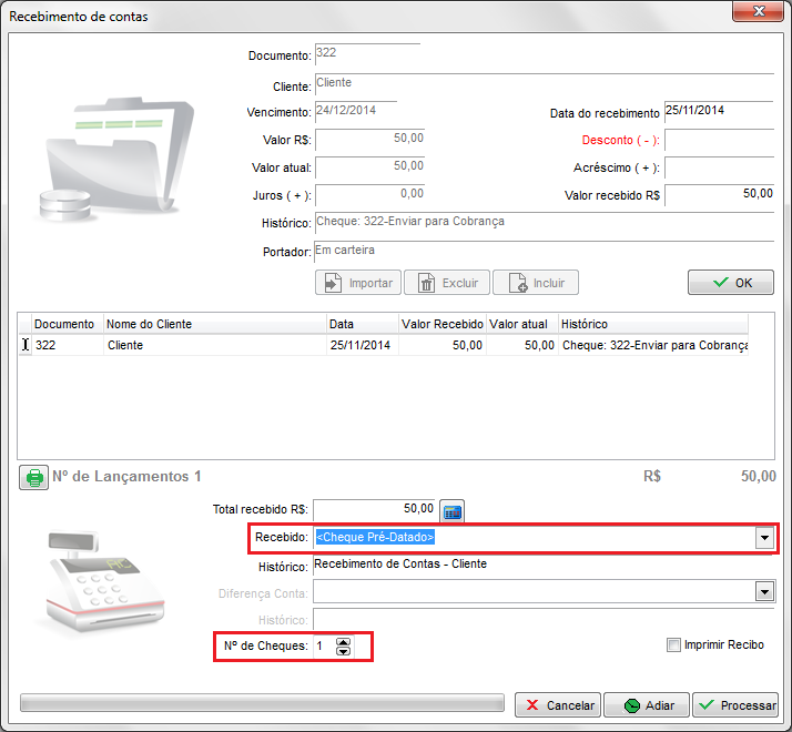 1. No módulo Cheques Pré-Datados, selecione um cheque já cadastrado;